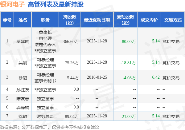 银河电子的高管列表及最新持股情况如下: