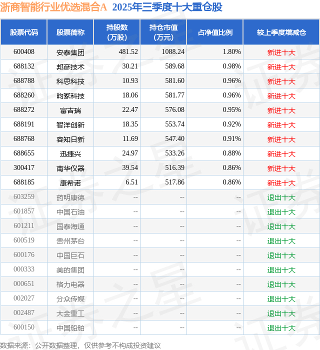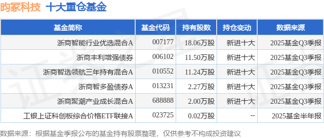 根据2025基金Q3季报公募基金重仓股数据,重仓该股的公募基金共5家,其中持有数量最多的公募基金为浙商基金的浙商智能行业优选混合A。浙商智能行业优选混合A目前规模为5.84亿元,最新净值1.253(12月2日),较上一交易日下跌0.48%,近一年上涨37.8%。该公募基金现任基金经理为饶祖华。饶祖华在任的基金产品包括:浙商中证500增强A,管理时间为2025年8月25日至今,期间收益率为3.28%;浙商丰利增强债券,管理时间为2025年8月25日至今,期间收益率为-1.65%;浙商智多盈债券A,管理时间为2025年8月25日至今,期间收益率为-0.15%;浙商中证1000指数增强A,管理时间为2025年8月25日至今,期间收益率为0.29%。