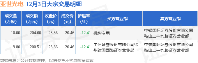 证券之星消息,12月3日亚世光电发生大宗交易,交易数据如下:
