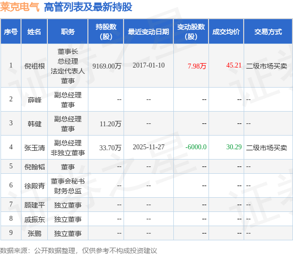 莱克电气近半年内的董监高及核心技术人员增减持详情如下: