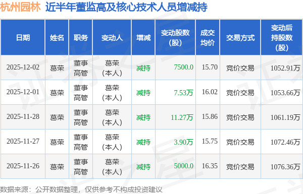 杭州园林近半年内的董监高及核心技术人员增减持详情如下: