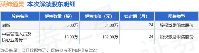 证券之星消息,根据市场公开信息整理,莱绅通灵(603900)于12月4日将有24.0万股限售股份解禁,为公司股权激励限售股份,占公司总股本0.07%。(本次数据根据历史公告整理得出,实际情况以上市公司最新公告为准)最近一年内,该股累计解禁103.5万股,占总股本的0.3%。本次解禁后,公司还有127.5万股限售股份,占总股本0.37%。具体如下图所示: