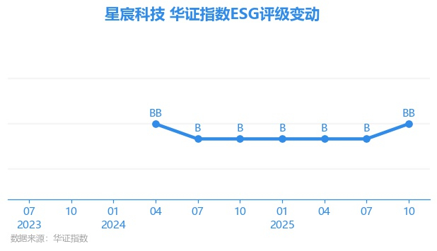 日前,华证指数公布了新一期(2025年10月31日)的ESG评级结果,星宸科技(301536.SZ)获得BB评级(华证指数评级为C起至AAA九档,C为最低档,AAA为其最高一级评级/AA为其第二档),上一期(2025年7月31日)ESG评级为B。本期ESG评级在531家电子设备、仪器和元件行业A股上市公司中排名第292(上一期排名第333)。