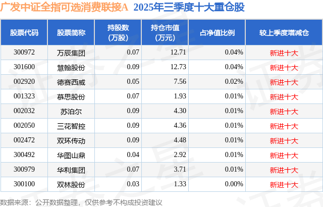 根据2025基金Q3季报公募基金重仓股数据,重仓该股的公募基金共1家,其中持有数量最多的公募基金为广发基金的广发中证全指可选消费联接A。广发中证全指可选消费联接A目前规模为1.69亿元,最新净值1.0744(12月3日),较上一交易日下跌0.29%,近一年上涨9.1%。该公募基金现任基金经理为姚曦。姚曦在任的基金产品包括:广发中证主要消费ETF,管理时间为2022年10月19日至今,期间收益率为-10.16%;广发中证全指原材料ETF,管理时间为2022年11月15日至今,期间收益率为26.12%;广发中证全指能源ETF,管理时间为2022年11月15日至今,期间收益率为20.7%;广发中证稀有金属主题ETF,管理时间为2023年1月10日至今,期间收益率为24.71%。