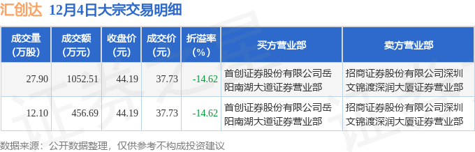 证券之星消息,12月4日汇创达发生大宗交易,交易数据如下: