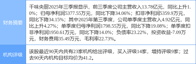 2025年10月28日,华鑫证券研究员孙山山,张倩发布了对千味央厨的研报《公司事件点评报告:新零售延续增势,渠道结构优化调整》,该研报对千味央厨给出“买入”评级。研报中预计2025-2027年EPS分别0.82/0.92/1.05(前值为0.84/0.94/1.06)元,当前股价对应PE分别为48/43/37倍,维持“买入”投资评级。证券之星数据中心根据近三年发布的研报数据计算,该研报作者对此股的盈利预测准确度为53.07%。