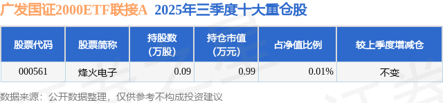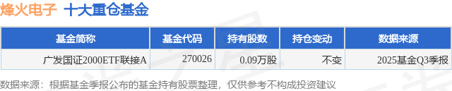 根据2025基金Q3季报公募基金重仓股数据,重仓该股的公募基金共1家,其中持有数量最多的公募基金为广发基金的广发国证2000ETF联接A。广发国证2000ETF联接A目前规模为1.17亿元,最新净值1.5509(12月4日),较上一交易日下跌0.44%,近一年上涨22.45%。该公募基金现任基金经理为霍华明。霍华明在任的基金产品包括:广发信息技术联接A,管理时间为2017年4月20日至今,期间收益率为52.63%;广发医药卫生联接A,管理时间为2017年4月20日至今,期间收益率为3.13%;广发中证全指医药卫生ETF,管理时间为2017年4月20日至今,期间收益率为3.19%;广发中证全指信息技术ETF,管理时间为2017年4月20日至今,期间收益率为57.93%。