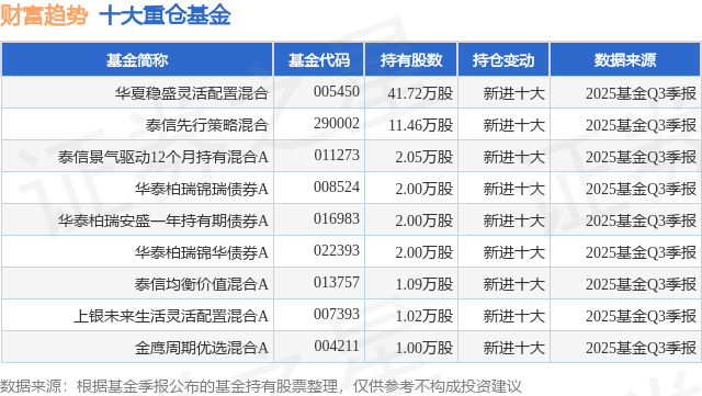 根据2025基金Q3季报公募基金重仓股数据,重仓该股的公募基金共9家,其中持有数量最多的公募基金为华夏基金的华夏稳盛灵活配置混合。华夏稳盛灵活配置混合目前规模为10.9亿元,最新净值1.3212(12月4日),较上一交易日上涨0.32%,近一年上涨4.26%。该公募基金现任基金经理为罗皓亮。