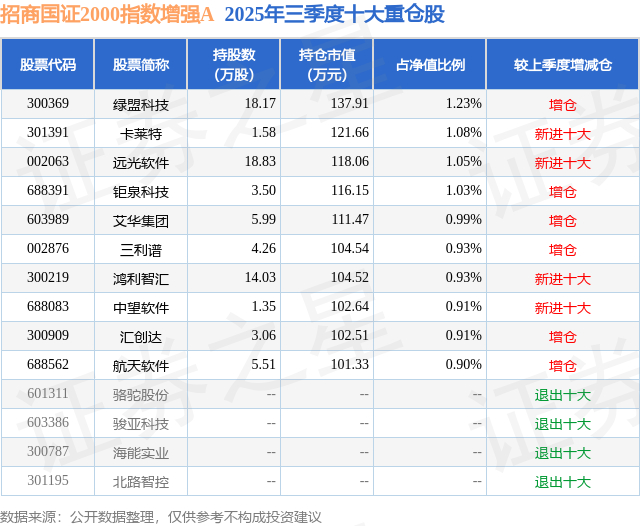 招商国证2000指数增强A的前十大重仓股如下: