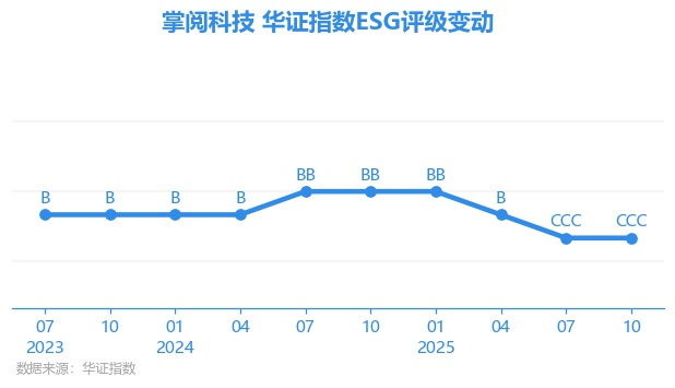 日前,华证指数公布了新一期(2025年10月31日)的ESG评级结果,掌阅科技(603533.SH)获得CCC评级(华证指数评级为C起至AAA九档,C为最低档,AAA为其最高一级评级/AA为其第二档),上一期(2025年7月31日)ESG评级为CCC。本期ESG评级在165家软件行业A股上市公司中排名第148(上一期排名第143)。