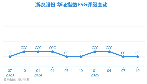 日前,华证指数公布了新一期(2025年10月31日)的ESG评级结果,浙农股份(002758.SZ)获得CC评级(华证指数评级为C起至AAA九档,C为最低档,AAA为其最高一级评级/AA为其第二档),上一期(2025年7月31日)ESG评级为CC。本期ESG评级在168家食品行业A股上市公司中排名第116(上一期排名第113)。