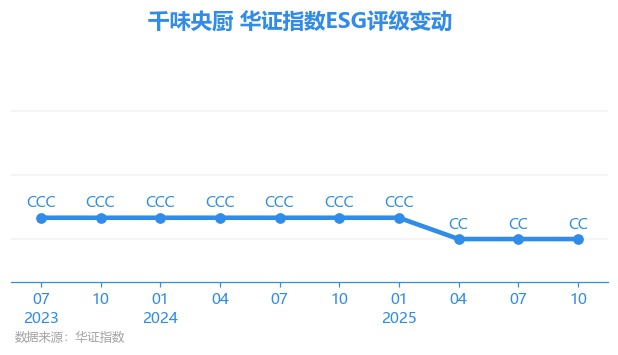 日前,华证指数公布了新一期(2025年10月31日)的ESG评级结果,千味央厨(001215.SZ)获得CC评级(华证指数评级为C起至AAA九档,C为最低档,AAA为其最高一级评级/AA为其第二档),上一期(2025年7月31日)ESG评级为CC。本期ESG评级在168家食品行业A股上市公司中排名第114(上一期排名第107)。