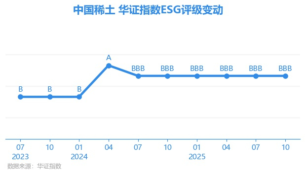 日前,华证指数公布了新一期(2025年10月31日)的ESG评级结果,中国稀土(000831.SZ)获得BBB评级(华证指数评级为C起至AAA九档,C为最低档,AAA为其最高一级评级/AA为其第二档),上一期(2025年7月31日)ESG评级为BBB。本期ESG评级在206家金属与采矿行业A股上市公司中排名第75(上一期排名第77)。
