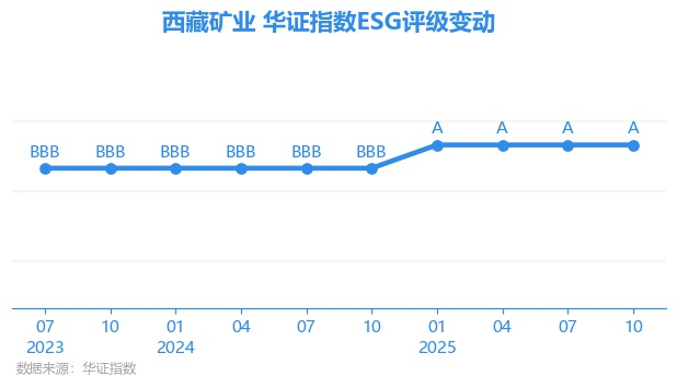 日前,华证指数公布了新一期(2025年10月31日)的ESG评级结果,西藏矿业(000762.SZ)获得A评级(华证指数评级为C起至AAA九档,C为最低档,AAA为其最高一级评级/AA为其第二档),上一期(2025年7月31日)ESG评级为A。本期ESG评级在206家金属与采矿行业A股上市公司中排名第38(上一期排名第44)。