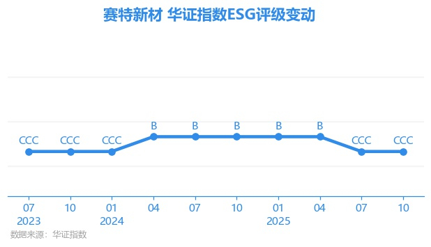 日前,华证指数公布了新一期(2025年10月31日)的ESG评级结果,赛特新材(688398.SH)获得CCC评级(华证指数评级为C起至AAA九档,C为最低档,AAA为其最高一级评级/AA为其第二档),上一期(2025年7月31日)ESG评级为CCC。本期ESG评级在494家化学制品行业A股上市公司中排名第261(上一期排名第261)。