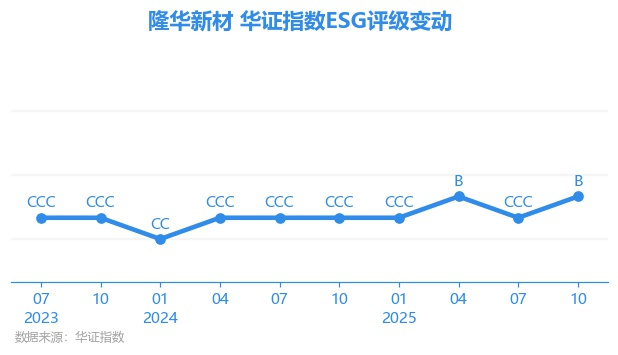 日前,华证指数公布了新一期(2025年10月31日)的ESG评级结果,隆华新材(301149.SZ)获得B评级(华证指数评级为C起至AAA九档,C为最低档,AAA为其最高一级评级/AA为其第二档),上一期(2025年7月31日)ESG评级为CCC。本期ESG评级在494家化学制品行业A股上市公司中排名第237(上一期排名第236)。