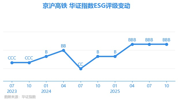 日前,华证指数公布了新一期(2025年10月31日)的ESG评级结果,京沪高铁(601816.SH)获得BBB评级(华证指数评级为C起至AAA九档,C为最低档,AAA为其最高一级评级/AA为其第二档),上一期(2025年7月31日)ESG评级为BBB。本期ESG评级在22家地面运输行业A股上市公司中排名第2(上一期排名第2)。