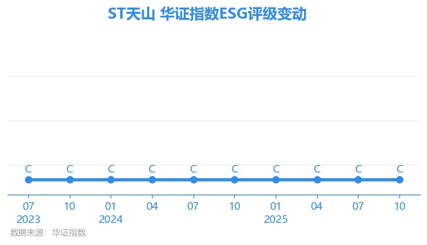 日前,华证指数公布了新一期(2025年10月31日)的ESG评级结果,*ST天山(300313.SZ)获得C评级(华证指数评级为C起至AAA九档,C为最低档,AAA为其最高一级评级/AA为其第二档),上一期(2025年7月31日)ESG评级为C。本期ESG评级在75家生物科技行业A股上市公司中排名第75(上一期排名第69)。
