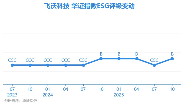 日前,华证指数公布了新一期(2025年10月31日)的ESG评级结果,飞沃科技(301232.SZ)获得B评级(华证指数评级为C起至AAA九档,C为最低档,AAA为其最高一级评级/AA为其第二档),上一期(2025年7月31日)ESG评级为CCC。本期ESG评级在330家电气设备行业A股上市公司中排名第236(上一期排名第254)。