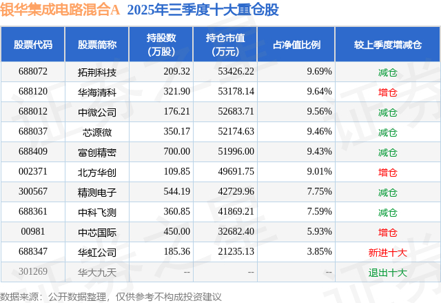 根据2025基金Q3季报公募基金重仓股数据,重仓该股的公募基金共37家,其中持有数量最多的公募基金为银华基金的银华集成电路混合A。银华集成电路混合A目前规模为23.54亿元,最新净值1.4769(12月8日),较上一交易日上涨1.63%,近一年上涨33.6%。该公募基金现任基金经理为方建。方建在任的基金产品包括:银华智荟内在价值灵活配置混合发起A,管理时间为2018年6月20日至今,期间收益率为211.88%;银华乐享混合A,管理时间为2021年6月22日至今,期间收益率为-10.27%;银华新锐成长混合A,管理时间为2022年3月31日至今,期间收益率为25.28%。