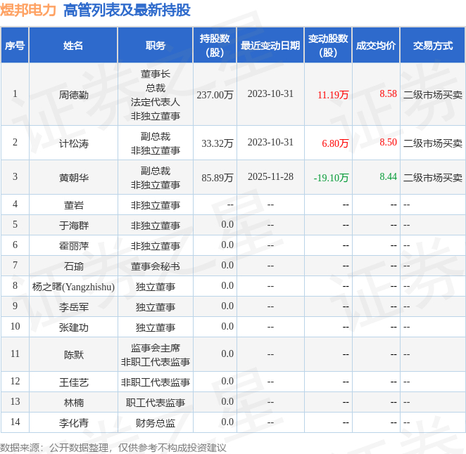 煜邦电力近半年内的董监高及核心技术人员增减持详情如下: