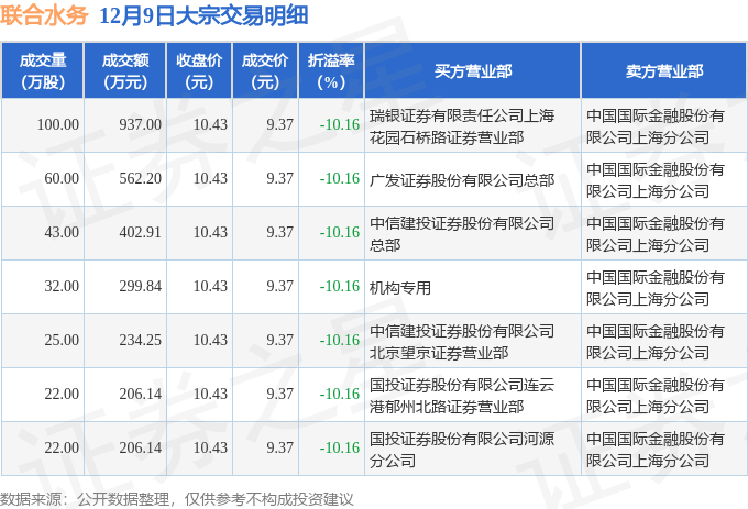 证券之星消息,12月9日联合水务发生大宗交易,交易数据如下: