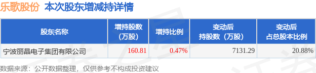证券之星消息,12月9日乐歌股份发布公告《乐歌股份:关于公司控股股东增持公司股份触及1%整数倍的公告》,其股东宁波丽晶电子集团有限公司于2025年11月24日至2025年12月8日间合计增持160.81万股,占公司目前总股本的0.4707%,变动期间该股股价上涨2.63%,截止12月8日收盘报14.06元。