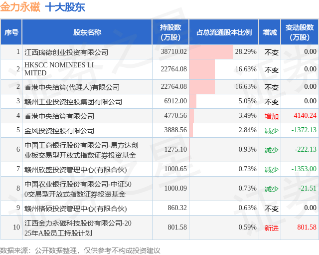 根据金力永磁2025年三季报公布的十大股东详情如下: