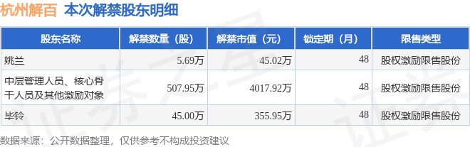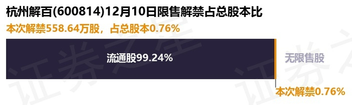 证券之星消息,根据市场公开信息整理,杭州解百(600814)于12月10日将有558.64万股限售股份解禁,为公司股权激励限售股份,占公司总股本0.76%。(本次数据根据历史公告整理得出,实际情况以上市公司最新公告为准)最近一年内,该股累计解禁603.33万股,占总股本的0.82%。本次解禁后,公司已无限售股份。具体如下图所示: