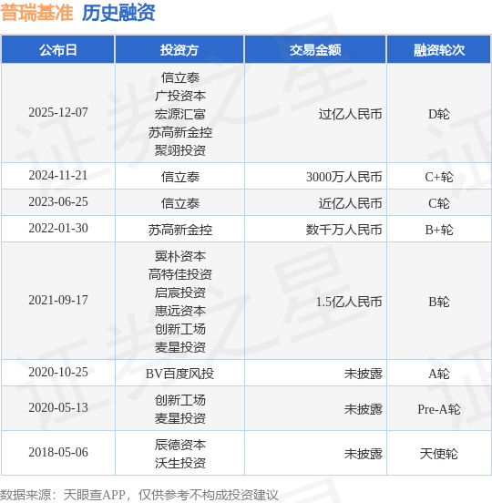 证券之星消息,根据天眼查APP于12月7日公布的信息整理,普瑞基准科技(北京)有限公司D轮融资,融资额过亿人民币,参与投资的机构包括信立泰,广投资本,宏源汇富,苏高新金控,聚翊投资。