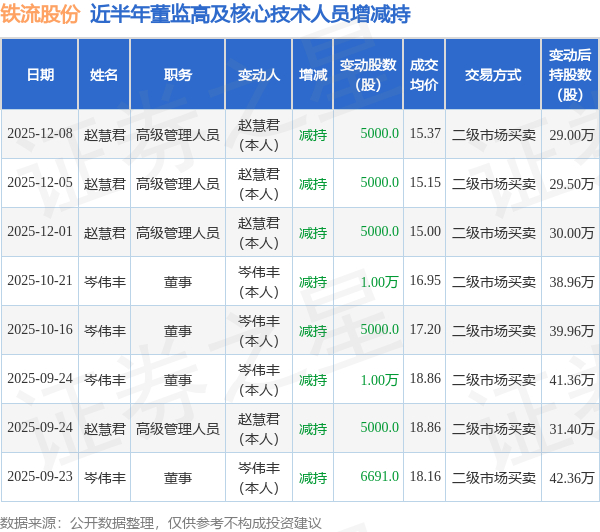铁流股份近半年内的董监高及核心技术人员增减持详情如下:
