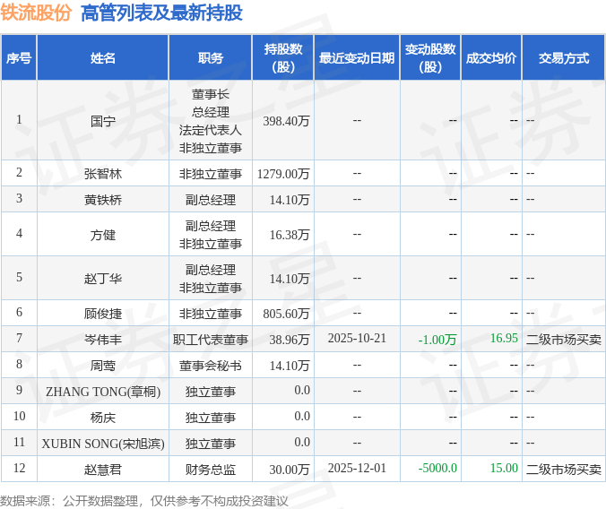 证券之星消息,根据12月10日市场公开信息、上市公司公告及交易所披露数据整理,铁流股份(603926)最新董监高及相关人员股份变动情况:2025年12月8日公司高级管理人员赵慧君共减持公司股份5000.0股,占公司总股本为0.0021%。变动期间公司股价上涨1.44%,12月8日当日收盘报15.47元。