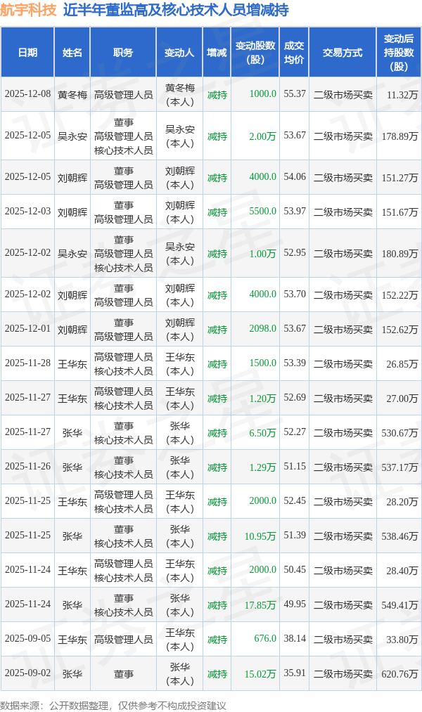 航宇科技近半年内的董监高及核心技术人员增减持详情如下: