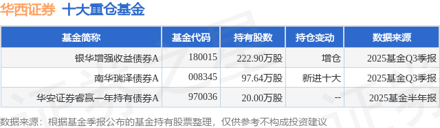 根据2025基金Q3季报公募基金重仓股数据,重仓该股的公募基金共2家,其中持有数量最多的公募基金为银华基金的银华增强收益债券A。银华增强收益债券A目前规模为22.27亿元,最新净值1.3149(12月10日),较上一交易日上涨0.14%,近一年上涨9.08%。该公募基金现任基金经理为冯帆。冯帆在任的基金产品包括:银华泰利灵活配置混合A,管理时间为2025年2月12日至今,期间收益率为2.98%;银华稳利灵活配置混合A,管理时间为2025年2月12日至今,期间收益率为6.21%;银华汇益一年持有期混合A,管理时间为2025年2月12日至今,期间收益率为2.79%。