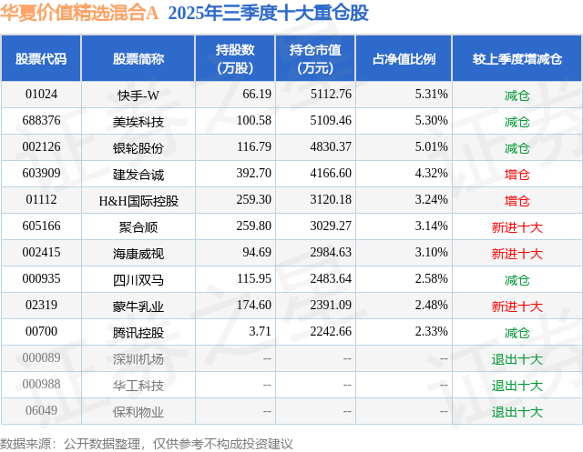 根据2025基金Q3季报公募基金重仓股数据,重仓该股的公募基金共3家,其中持有数量最多的公募基金为华夏基金的华夏价值精选混合A。华夏价值精选混合A目前规模为9.64亿元,最新净值1.9072(12月10日),较上一交易日上涨0.15%,近一年上涨42.01%。该公募基金现任基金经理为朱熠。朱熠在任的基金产品包括:华夏兴夏价值一年持有混合发起式A,管理时间为2023年5月5日至今,期间收益率为47.34%;华夏红利价值混合A,管理时间为2025年8月12日至今,期间收益率为5.89%。