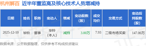 杭州解百近半年内的董监高及核心技术人员增减持详情如下: