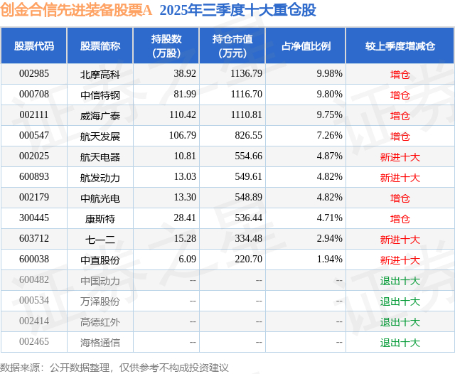 根据2025基金Q3季报公募基金重仓股数据,重仓该股的公募基金共1家,其中持有数量最多的公募基金为创金合信基金的创金合信先进装备股票A。创金合信先进装备股票A目前规模为0.38亿元,最新净值1.4752(12月11日),较上一交易日下跌0.37%,近一年上涨26.98%。该公募基金现任基金经理为李晗。