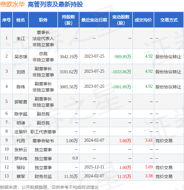 帝欧水华近半年内的董监高及核心技术人员增减持详情如下: