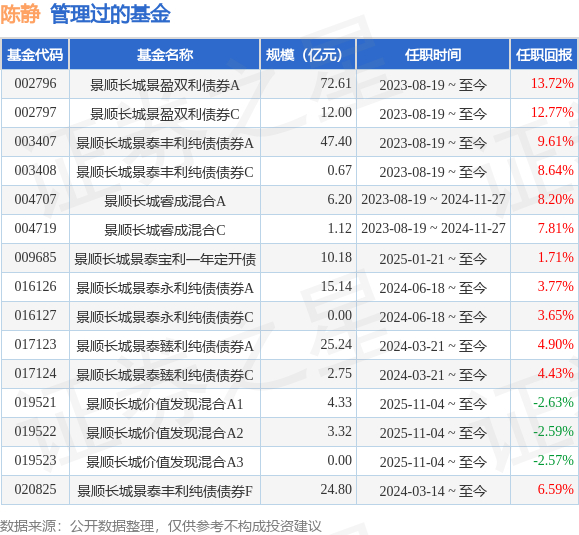 陈静女士:中国国籍,中央财经大学硕士。曾任中国人寿再保险股份有限公司投资部投资经理助理,中国人寿资产管理有限公司养老金及机构业务部投资经理,中国人寿养老保险股份有限公司养老保障业务机构部负责人、资深投资经理。2023年5月加入景顺长城基金管理有限公司,担任养老及资产配置部副总经理,自2023年8月起担任养老及资产配置部基金经理,现任养老及资产配置部副总经理、基金经理。2023年8月19日担任景顺长城景泰丰利纯债债券型证券投资基金基金经理。2023年8月19日担任景顺长城景盈双利债券型证券投资基金基金经理。2024年3月21日担任景顺长城景泰臻利纯债债券型证券投资基金基金经理。2024年6月18日起担任景顺长城景泰永利纯债债券型证券投资基金的基金经理。2023年08月19日至2024年11月26日担任景顺长城睿成灵活配置混合型证券投资基金基金经理。2025年1月21日起担任景顺长城景泰宝利一年定期开放纯债债券型发起式证券投资基金基金经理。2025年11月4日担任景顺长城价值发现混合型证券投资基金基金经理。