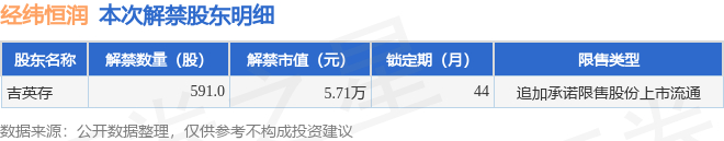 证券之星消息,根据市场公开信息整理,经纬恒润(688326)于12月15日将有591.0股限售股份解禁,为公司追加承诺限售股份上市流通,占公司总股本0.0%。(本次数据根据历史公告整理得出,实际情况以上市公司最新公告为准)最近一年内,该股累计解禁3203.74万股,占总股本的26.71%。本次解禁后,公司还有844.38万股限售股份,占总股本7.04%。具体如下图所示: