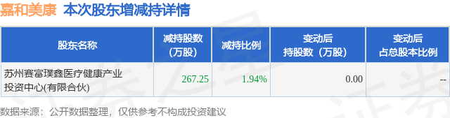 证券之星消息,12月15日嘉和美康发布公告《嘉和美康:嘉和美康股东减持股份结果公告》,其股东苏州赛富璞鑫医疗健康产业投资中心(有限合伙)于2025年9月16日至2025年12月12日间合计减持267.25万股,占公司目前总股本的1.9424%,变动期间该股股价下跌28.75%,截止12月12日收盘报21.46元。