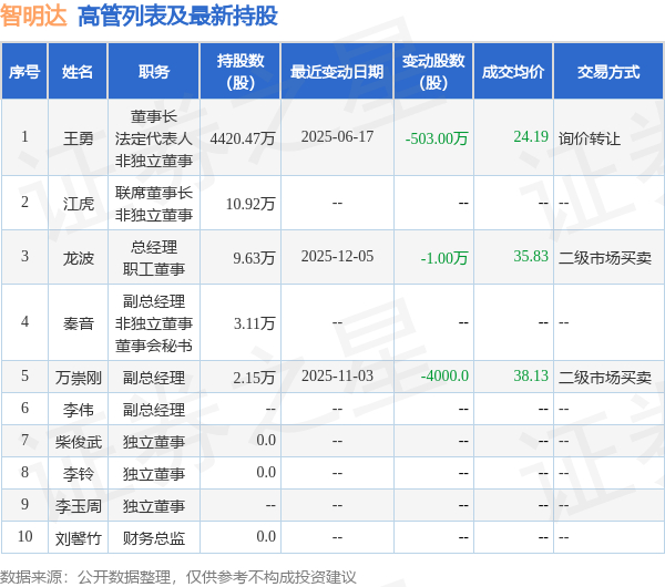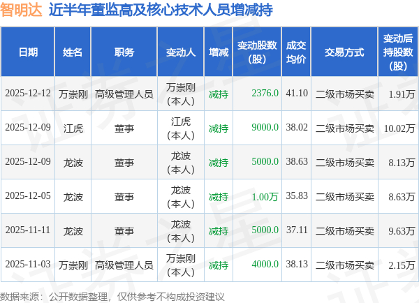 智明达近半年内的董监高及核心技术人员增减持详情如下: