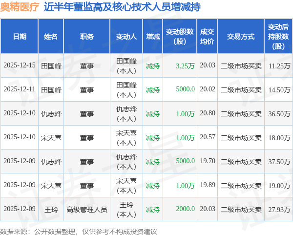 证券之星消息,根据12月15日市场公开信息、上市公司公告及交易所披露数据整理,奥精医疗(688613)最新董监高及相关人员股份变动情况:2025年12月11日至2025年12月15日公司董事田国峰共减持公司股份3.75万股,占公司总股本为0.0273%。变动期间公司股价下跌0.1%,12月15日当日收盘报20.02元。
