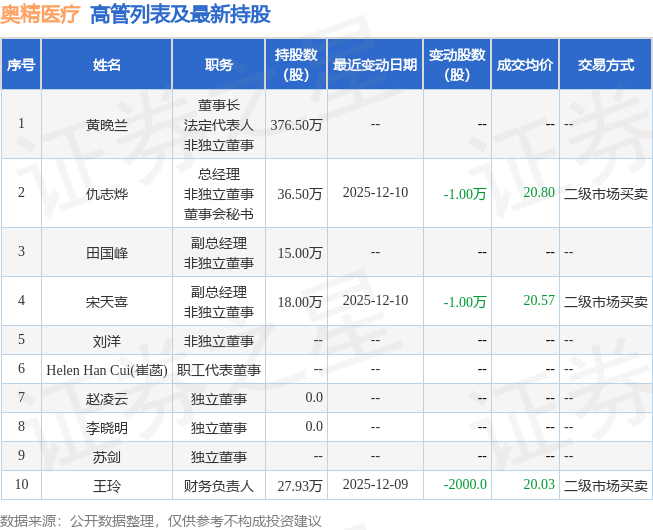 奥精医疗近半年内的董监高及核心技术人员增减持详情如下:
