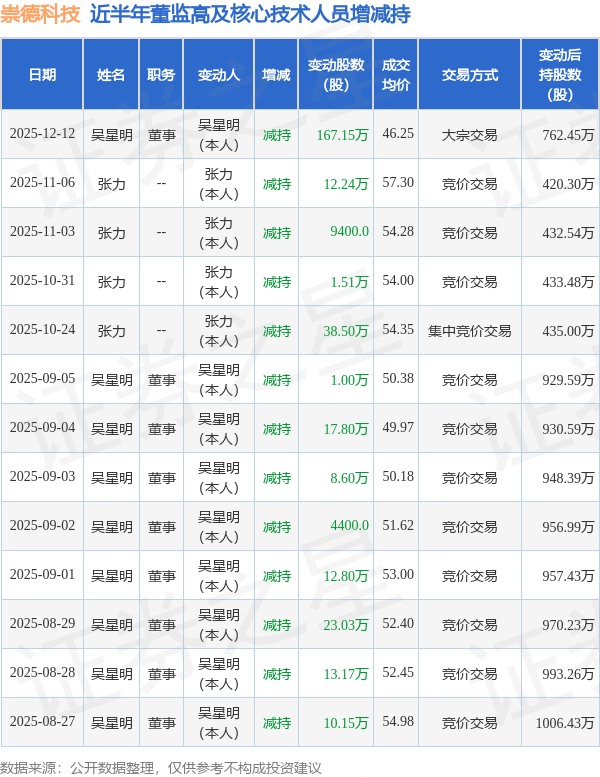 崇德科技近半年内的董监高及核心技术人员增减持详情如下: