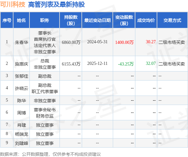 可川科技近半年内的董监高及核心技术人员增减持详情如下: