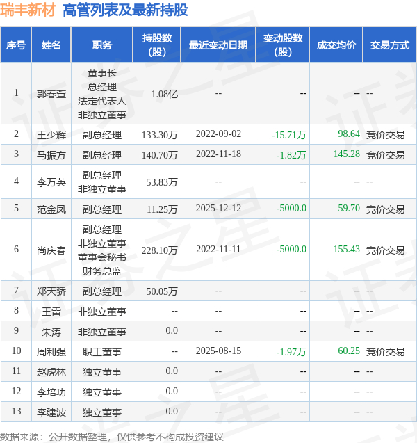 瑞丰新材近半年内的董监高及核心技术人员增减持详情如下: