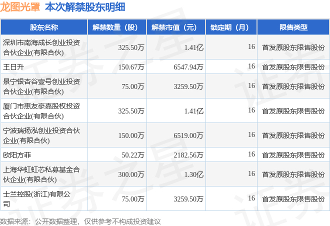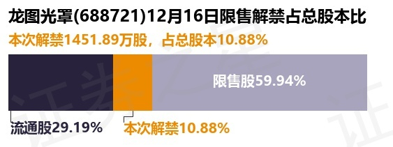 证券之星消息,根据市场公开信息整理,龙图光罩(688721)于12月16日将有1451.89万股限售股份解禁,为公司首发原股东限售股份,占公司总股本10.88%。(本次数据根据历史公告整理得出,实际情况以上市公司最新公告为准)最近一年内,该股累计解禁1387.04万股,占总股本的10.39%。本次解禁后,公司还有8001.55万股限售股份,占总股本59.94%。具体如下图所示:
