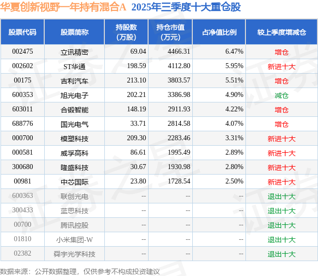 华夏创新视野一年持有混合A的前十大重仓股如下: