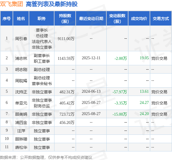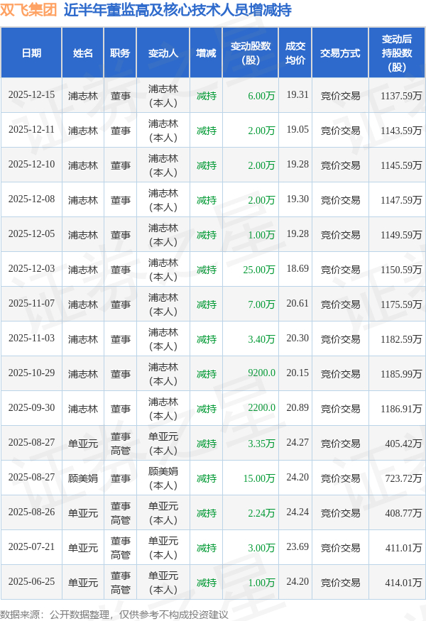 双飞集团近半年内的董监高及核心技术人员增减持详情如下: